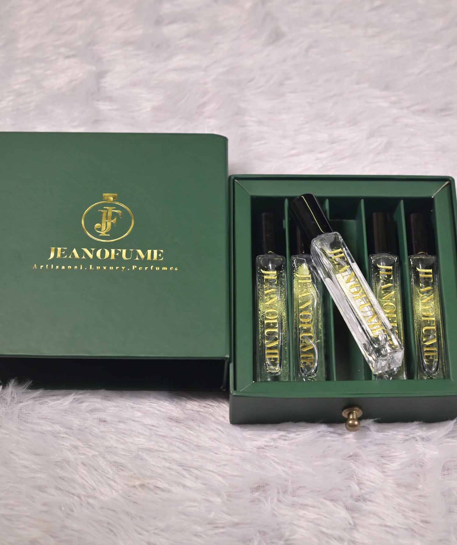 Luxurious sets of 5 perfumes (10 ml each), with customisable metal stickers on bottles and packagingβideal for branding your gesture, your way. Or make it a set of 7 perfumes for 7 days.