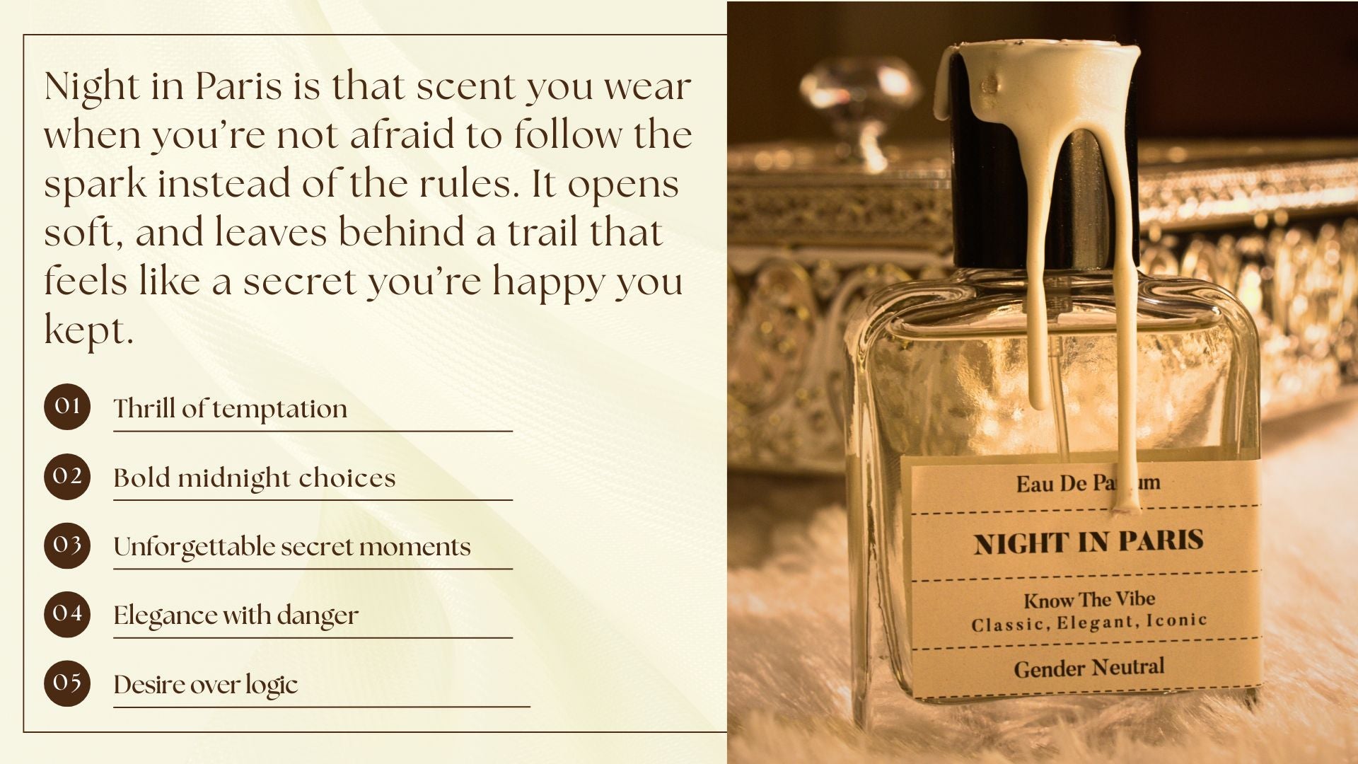 Radiating refined sensuality, Night in Paris is designed for those who appreciate understated luxury and lasting impressions. Perfect for evening wear or special occasions, it evokes the romance of Parisian nights—elegant, captivating, and endlessly chic.